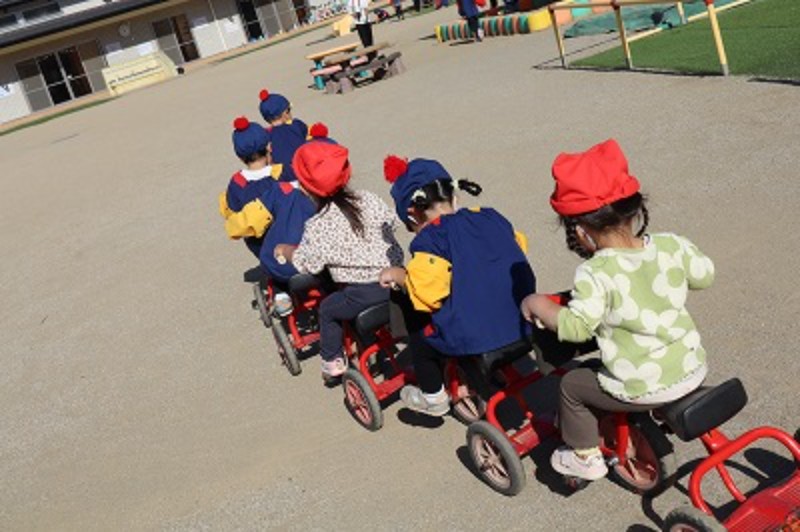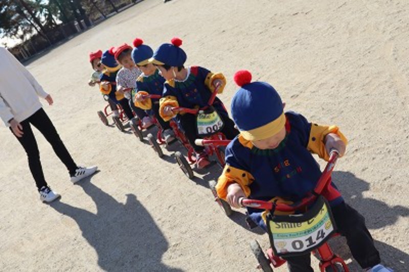 三輪車を遊びを通して始めた頃から比べるとペダルに足を乗せ自分の足で漕ごうとする姿が見られるようになりましたね♪最初の漕ぎだしはまだまだ難しいですが先生たちの力を借りて、よいしょ!!少しの距離を力を合わせて一生懸命進みました★