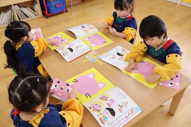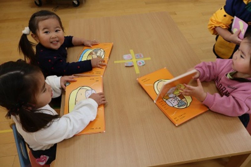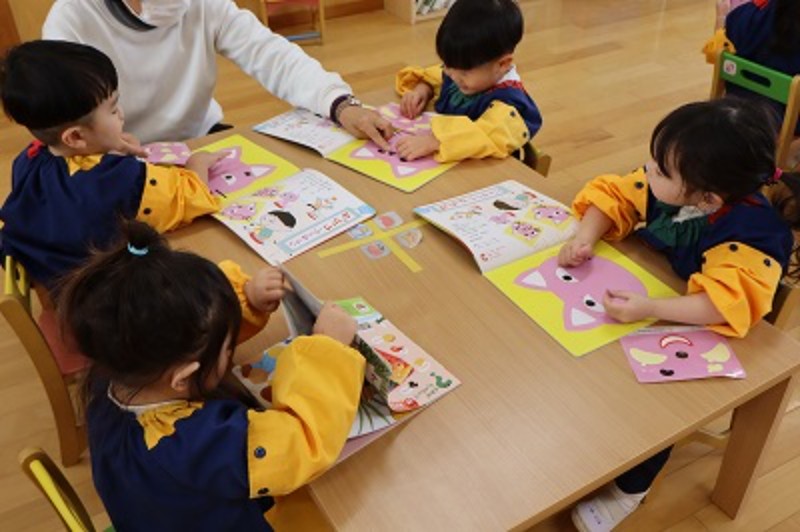 のんびり絵本タイムです・・♡パピー組さんの今月の絵本は、日本の伝統遊び福笑い~猫version~