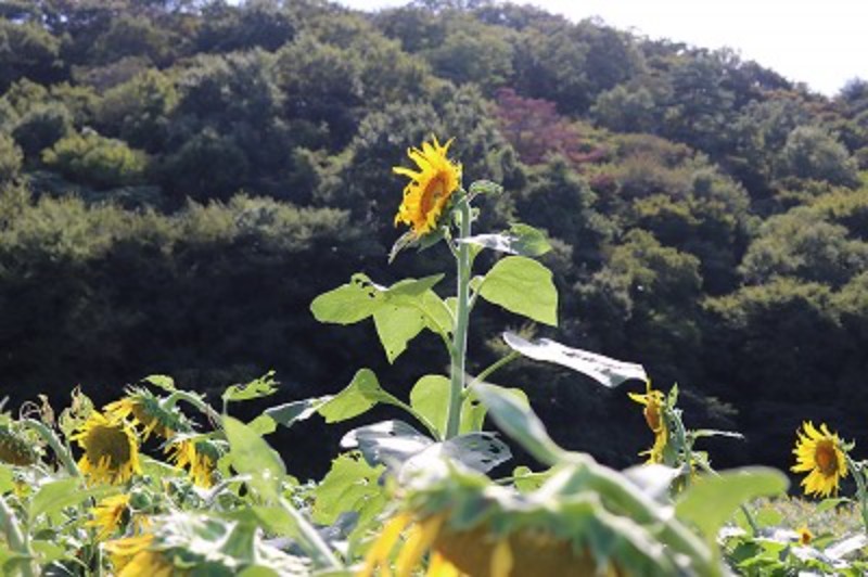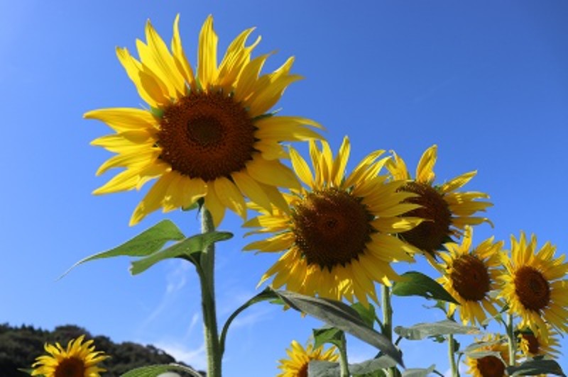 満開の向日葵畑☆その中でも特に目立っていたのが空に向かって真っすぐと伸びた1本の向日葵でした。