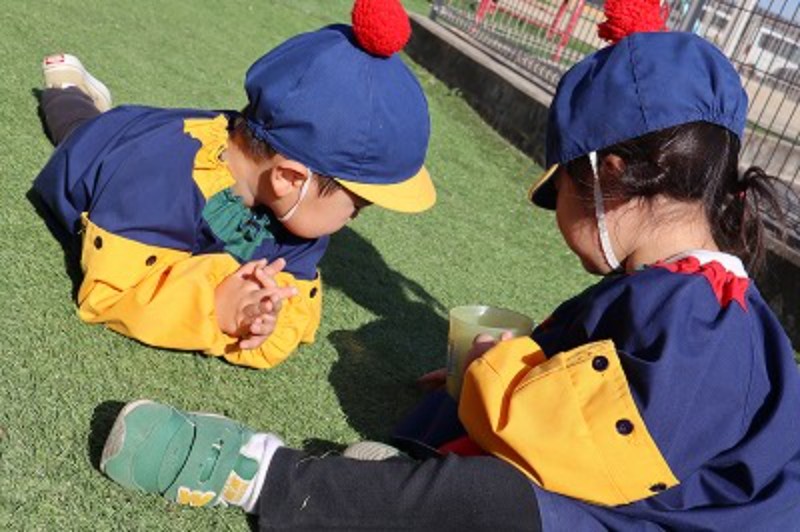 未満児クラス電車しゅっぱーつ!!【前のお友達を抜かさない】がお約束です♪事務所前に到着!何かを見つけたようす・・。