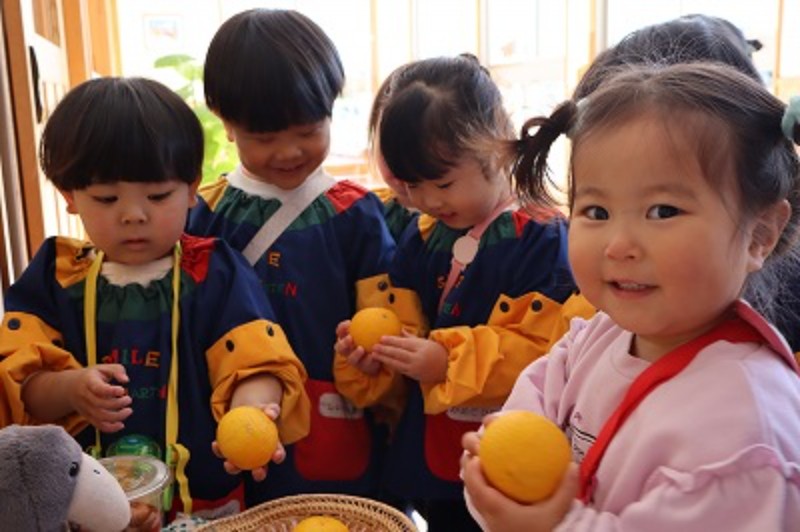 「みかん・・?」とみんな触って匂いを嗅いでみて★興味深々の未満児クラスのお友達でした。