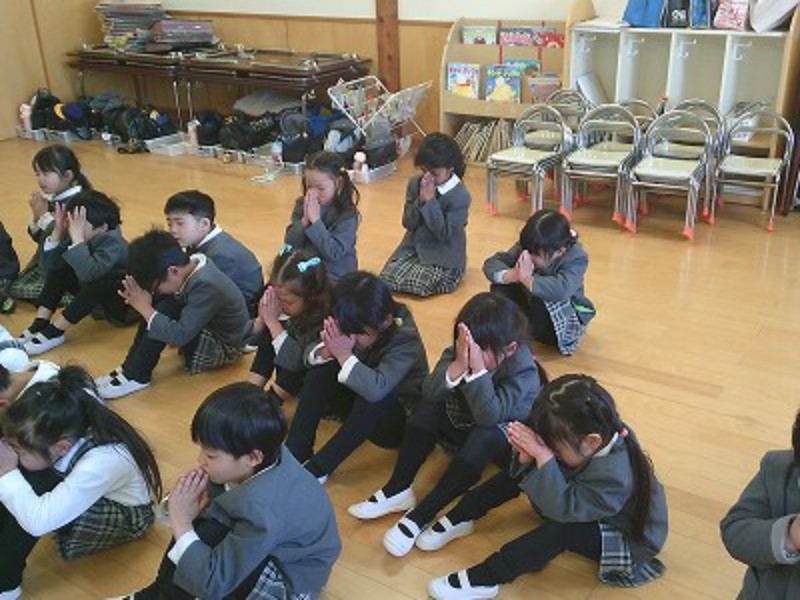 地震や火災はいつ起こるか分からない…だからこそ、「もしも」のときに対応出来るよう日々の訓練をしながら、意識して備えていきたいと思います。地震発生時刻に合わせて預かり保育で「黙とう」を行いました。