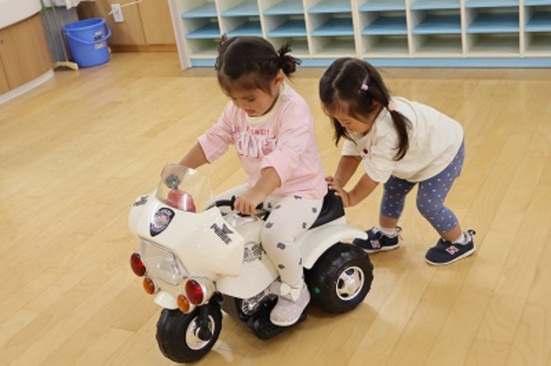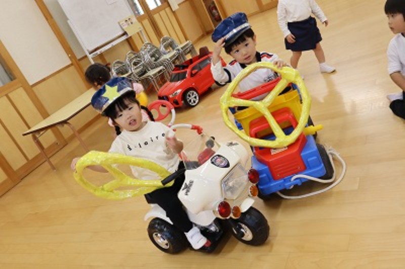あれもこれもとどれも魅力的な乗り物ばかり♡(幼稚園への寄付で素敵なおもちゃを頂きました)帽子を被ってなりきってみたり♪お友達を押してあげたり♪