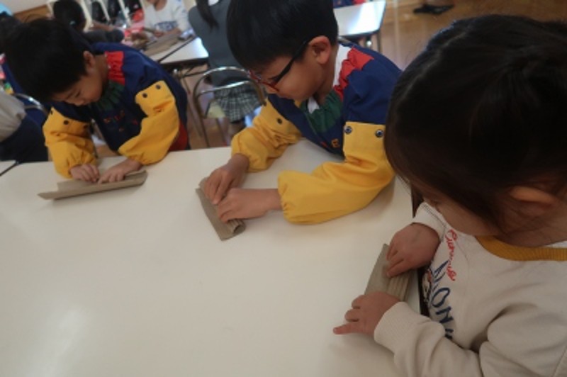 新聞紙や紙皿・厚紙みんな楽しそうにペンを走らせたり、折ったり・丸めたり♬