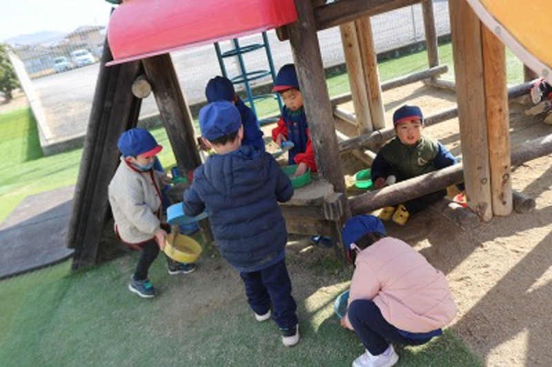 園庭で遊んでいると、元気な声が聞こえてきました!「いらっしゃいませ~!」「ピザありますよ!」お友達と一緒に協力しながらお店屋さんごっこをしていましたよ♬