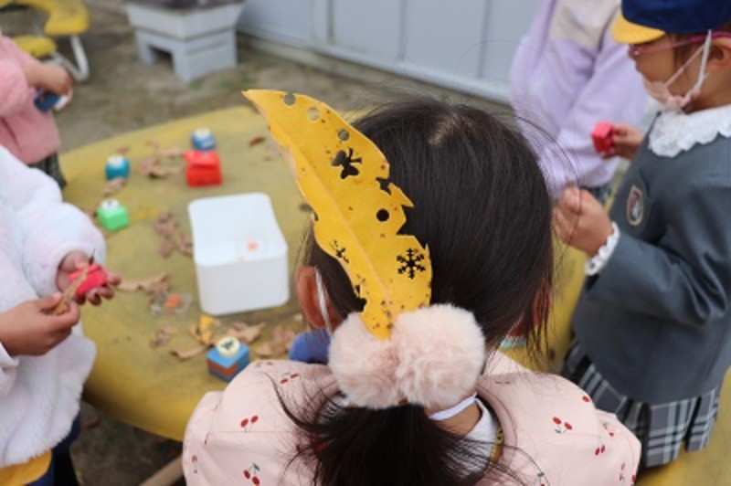 型抜きが終わった葉っぱも髪飾りに変身✨遊び終わった葉っぱのパーツは大事にお持ち帰りしていますのでお家でもお話を聞いてみて下さい!