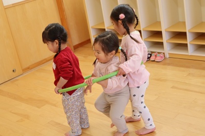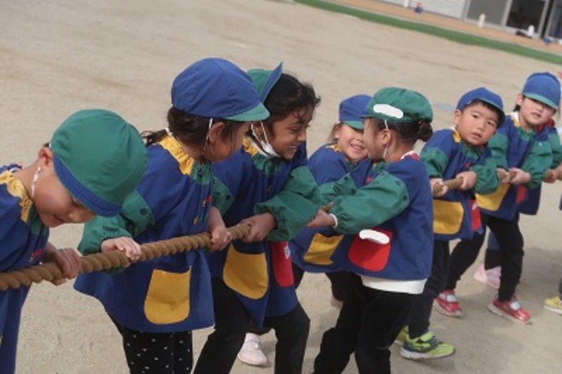 今日はぞう組さんとぱんだ組、うさぎ組で綱引きをしました!太い綱を小さな手で引いて、頑張りましたが・・・やっぱりぞう組さんは強い!!