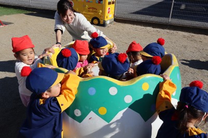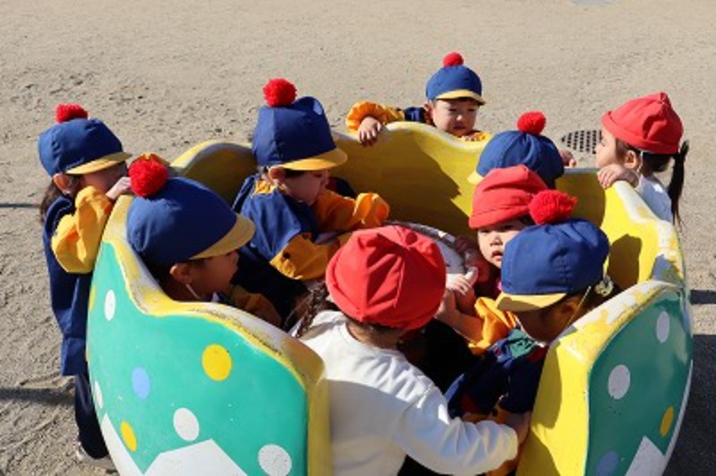 今日から12月★新しいお友達も加わり、元気にスタートです!クルクルコーヒーカップに集まる未満児クラスのお友達♪乗るチームと回すチームに分かれていましたがう~ん・・!重たい・・!