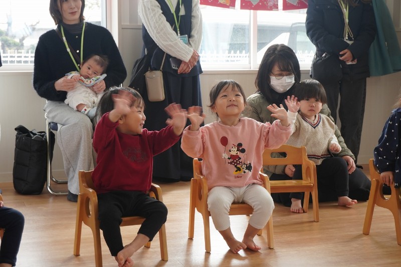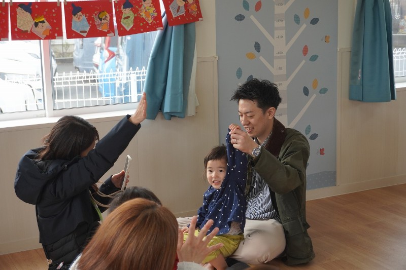 緊張しながらもパパやママの前でお返事、歌、手遊びをしたり