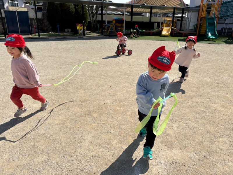 リボンを持って風と競走した時と風の弱い時はどうかな??「あれ??」リボンがヒラヒラしない・・・