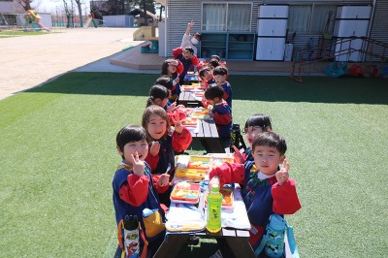 天気が良かったので、芝生の上でスペシャルランチ★ご飯をおにぎりにしてピクニック気分を味わえましたね!涼しい風が吹く中で、大好きなお友達と楽しそうにお話をしながら食べていて、ニコニコ笑顔な子ども達でした♬