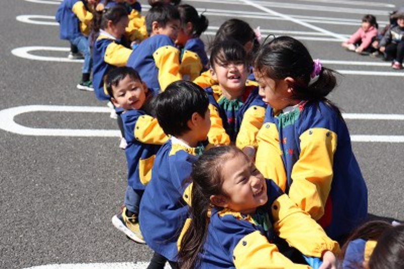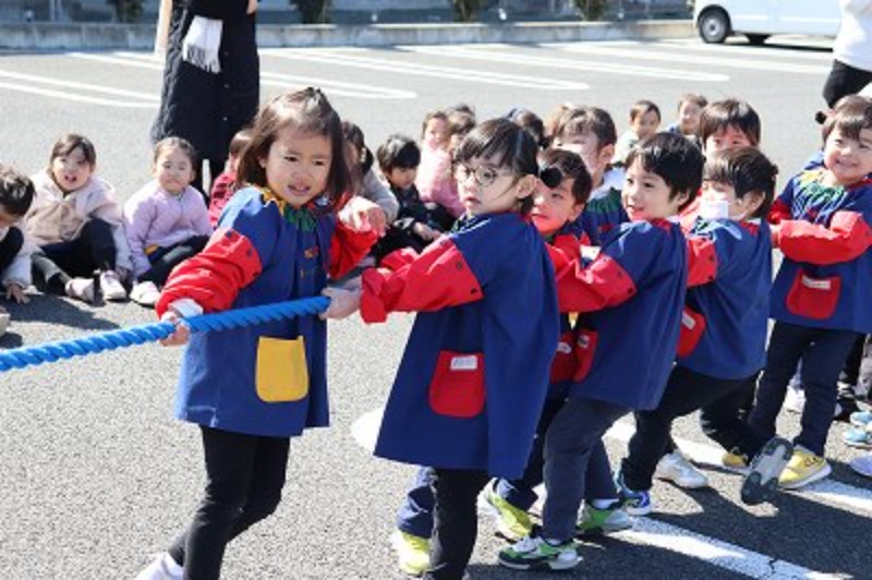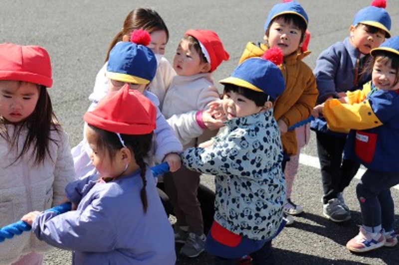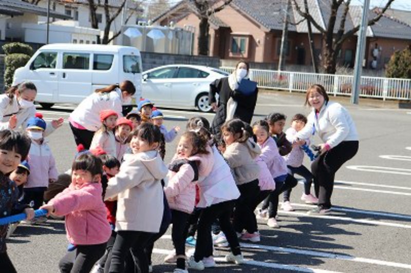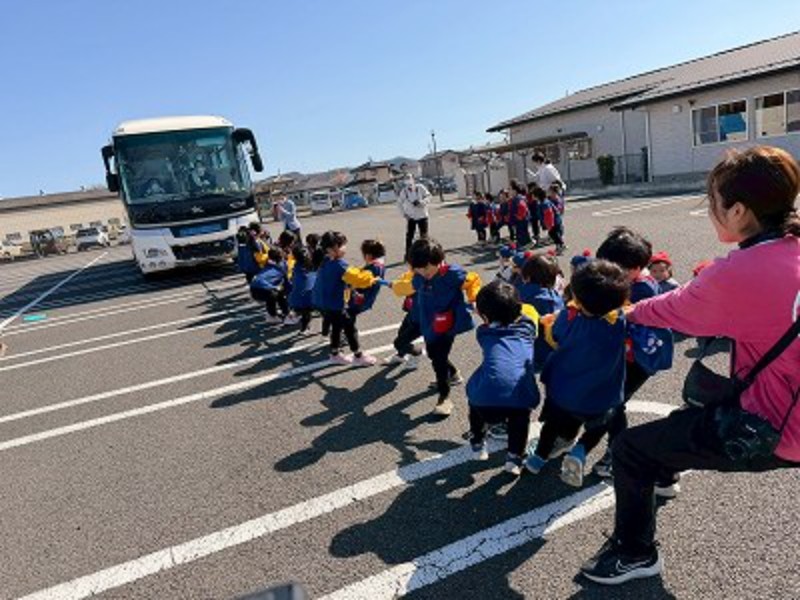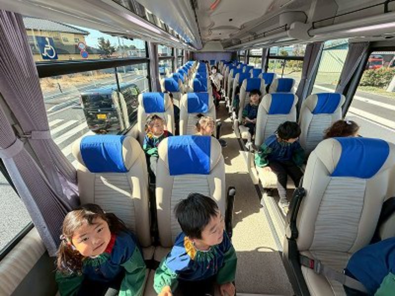 いつも園外に出かけている汽車バスとは違って大きなバス!乗って発進すると・・・「え!大きい車の上まで見えちゃう!」「こんなに窓が大きいの?!」と大興奮の子ども達でした!バスの中でもレクをしたり、バスごっこの歌を歌ったりして盛り上がっていましたよ!ドライブの後は毎年恒例のバスVS子ども達の綱引き!!