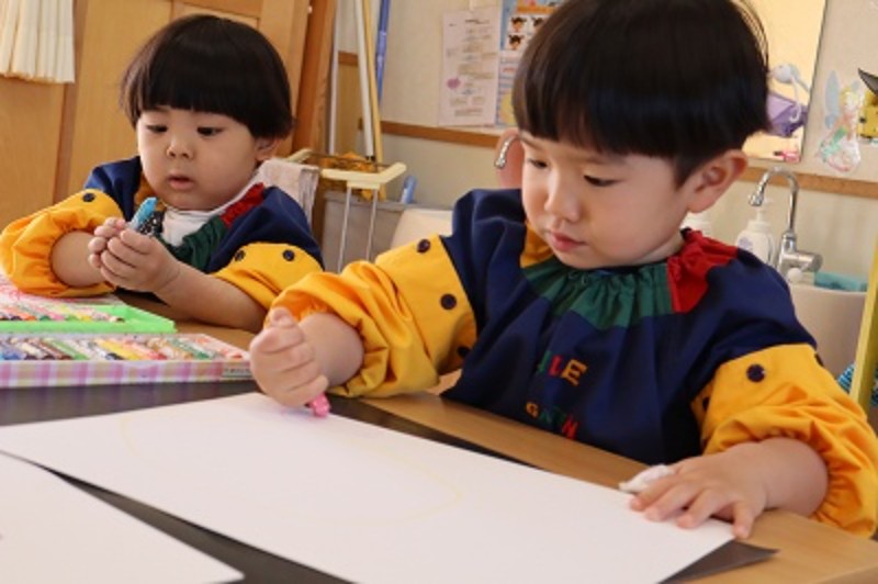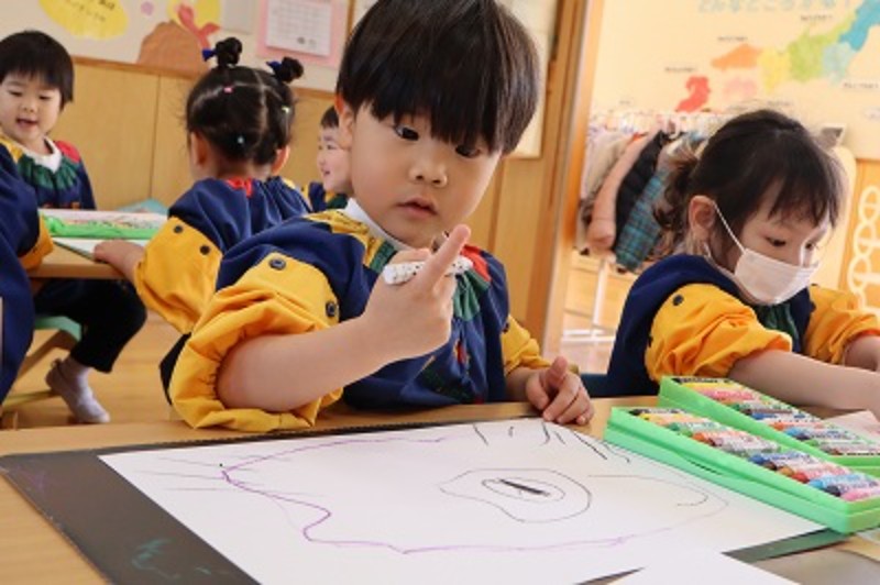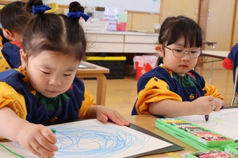 「どんな色がすき♡?」とクレヨンケースを眺めながら、好きな色をPickup!!白い画用紙に色々な色を使いながら思いきり描きました。