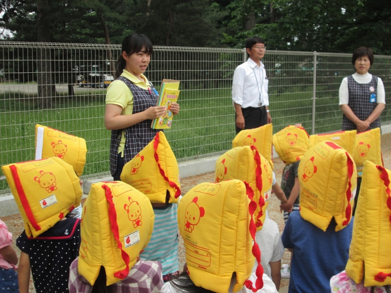 防災頭巾をしっかりとかぶり、火災の時はどう避難するのか学びます!