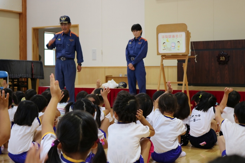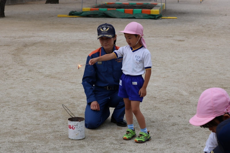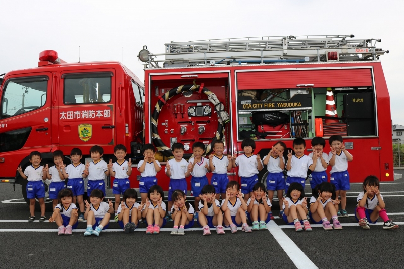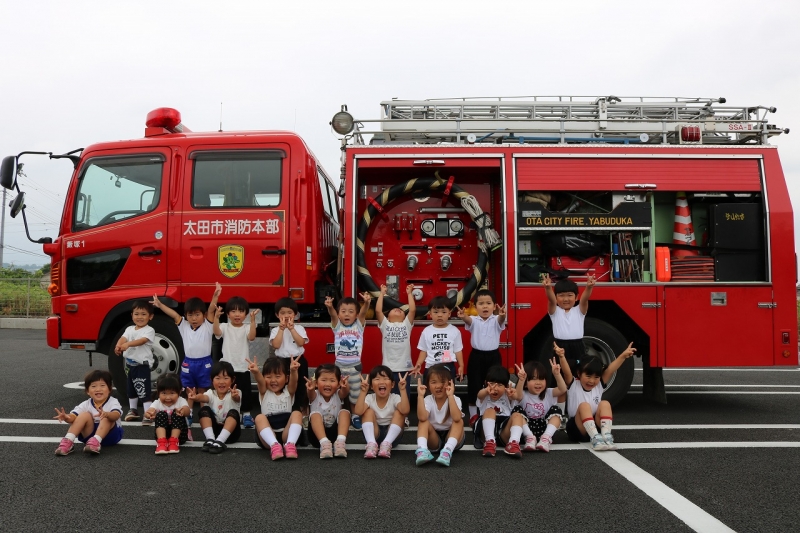 消防署の方に来ていただき、花火の正しい使い方を学びました。最後には、消防車と一緒にパシャリ♪