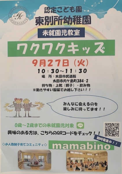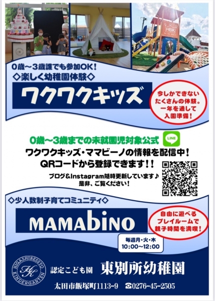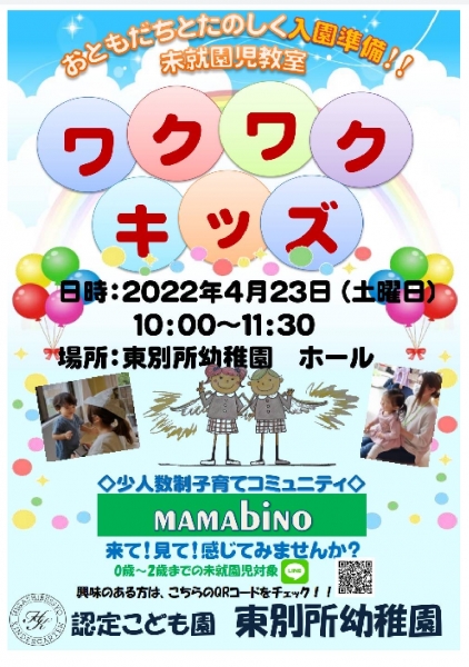 4月23日(土)に予定していた令和4年度 未就園児教室 ワクワクKIDSを以下の日程で延期致します。お間違えのない様、ご来園ください♪令和4年度 HBKワクワクKIDS Start!!令和4年5月21日(土)open:10:00 Start:10:30東別所幼稚園ってどんな所??未就園児のお友達!!小さなお子様がいらっしゃるパパ&ママ!!HBKに流れる空気を体感するチャンスです❤︎お友達もお誘い合わせの上お気軽に遊びに来てください♪可愛い皆さんに会える事を楽しみにしています!!興味のある方は未就園児教室のボタンをクリック!!